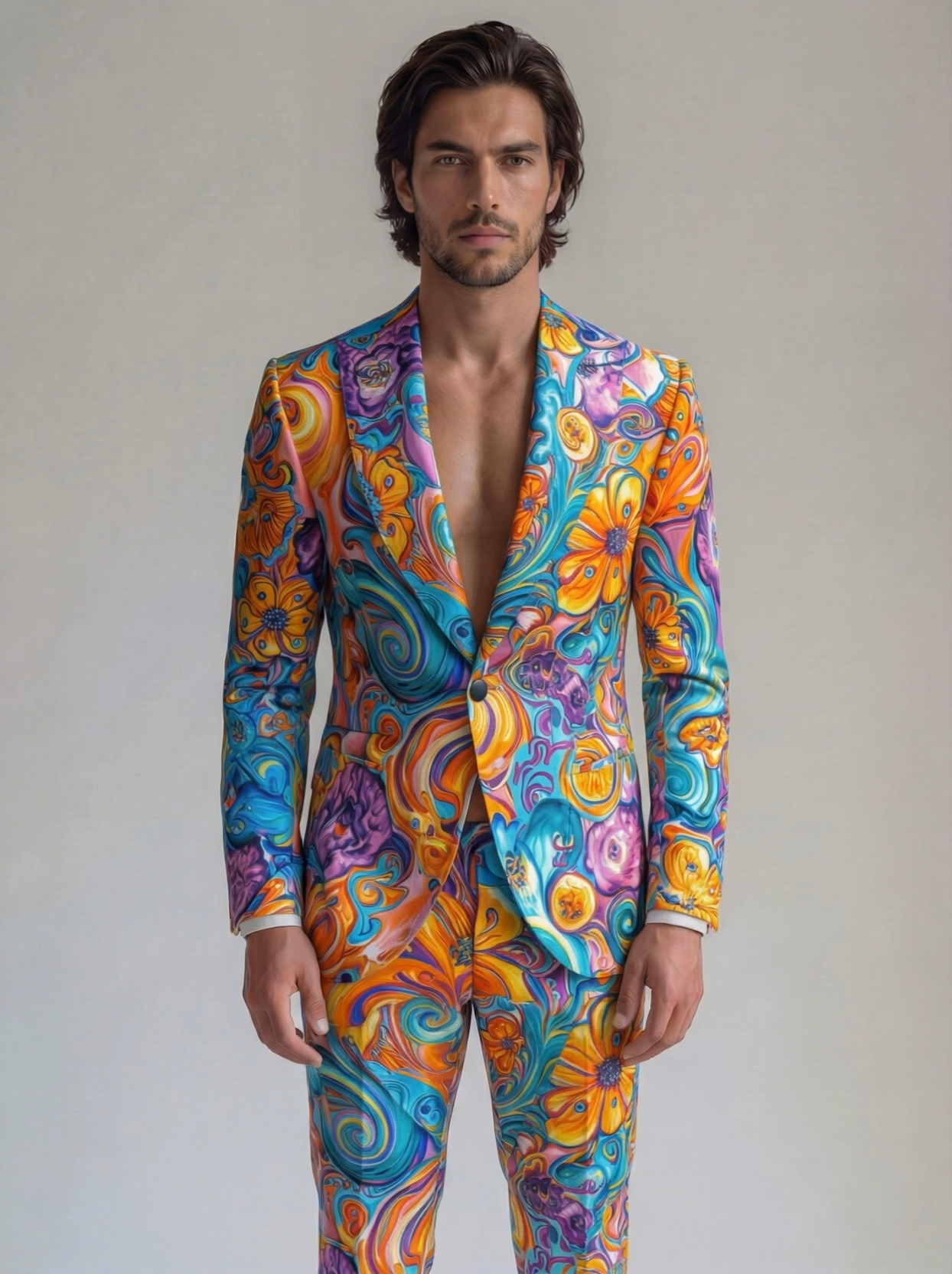This vibrant men's suit features a captivating psychedelic swirl pattern, showcasing a mesmerizing blend of flowing blues, purples, oranges, and teals that create an iridescent effect. The abstract design is tailored into a sharp, fitted silhouette, complete with peak lapels on the jacket, offering a bold and artistic statement. Its smooth, possibly satin-like fabric enhances the vivid colors and fluid lines, making it perfect for distinctive occasions.